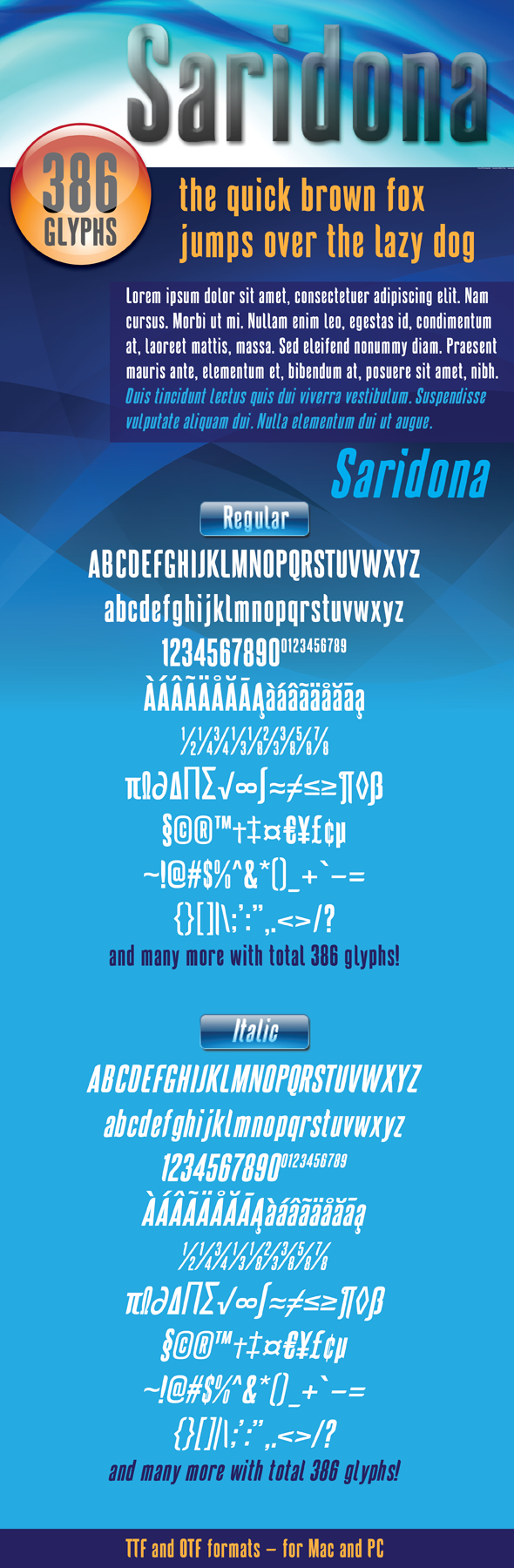 Saridona is a modern san-serif font with the stylish curve in all characters. Saridona looks elegant and strong suitable for flyers, posters, headlines, logotypes and many more. This font can use in Mac or PC. Package include: - TTF and OTF font file - Regular and Italic style - 386 glyphs include: – All uppercase and lowercase characters – Numerals and fractions – Accented characters – Currency symbols: Dollars, cent, Yen, Pound, Euro. – Copyright, Trademark and Registered symbols.