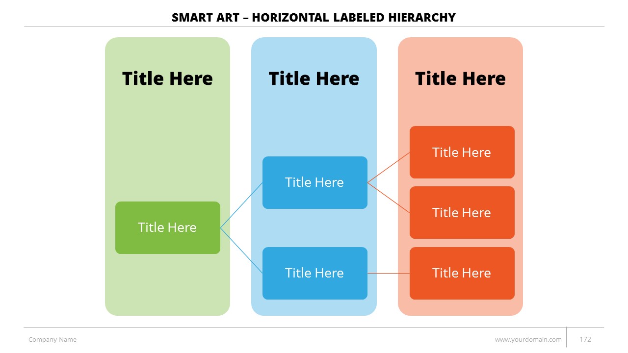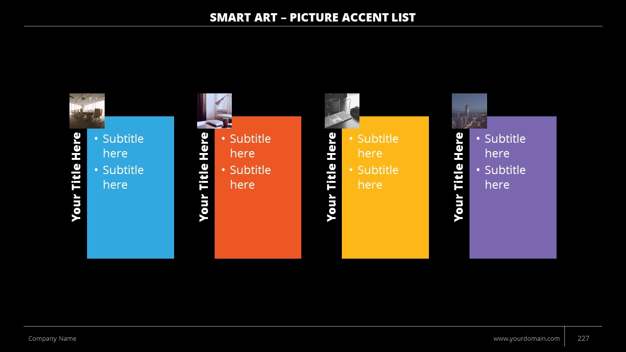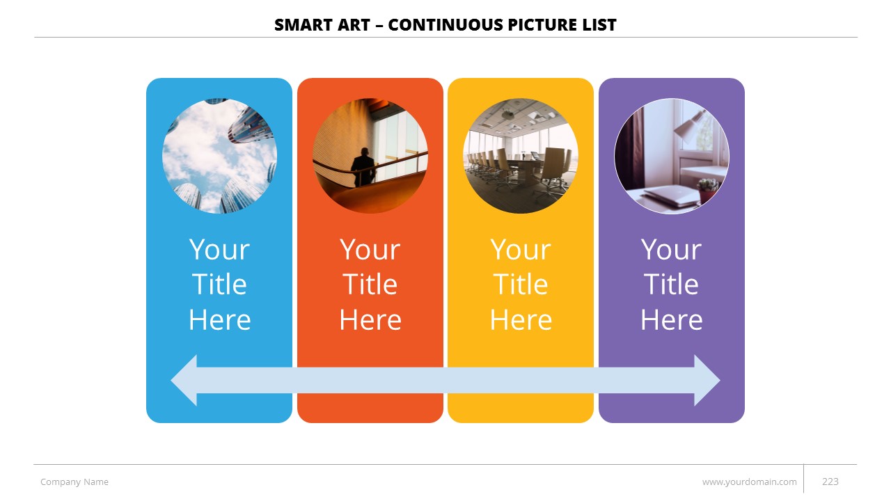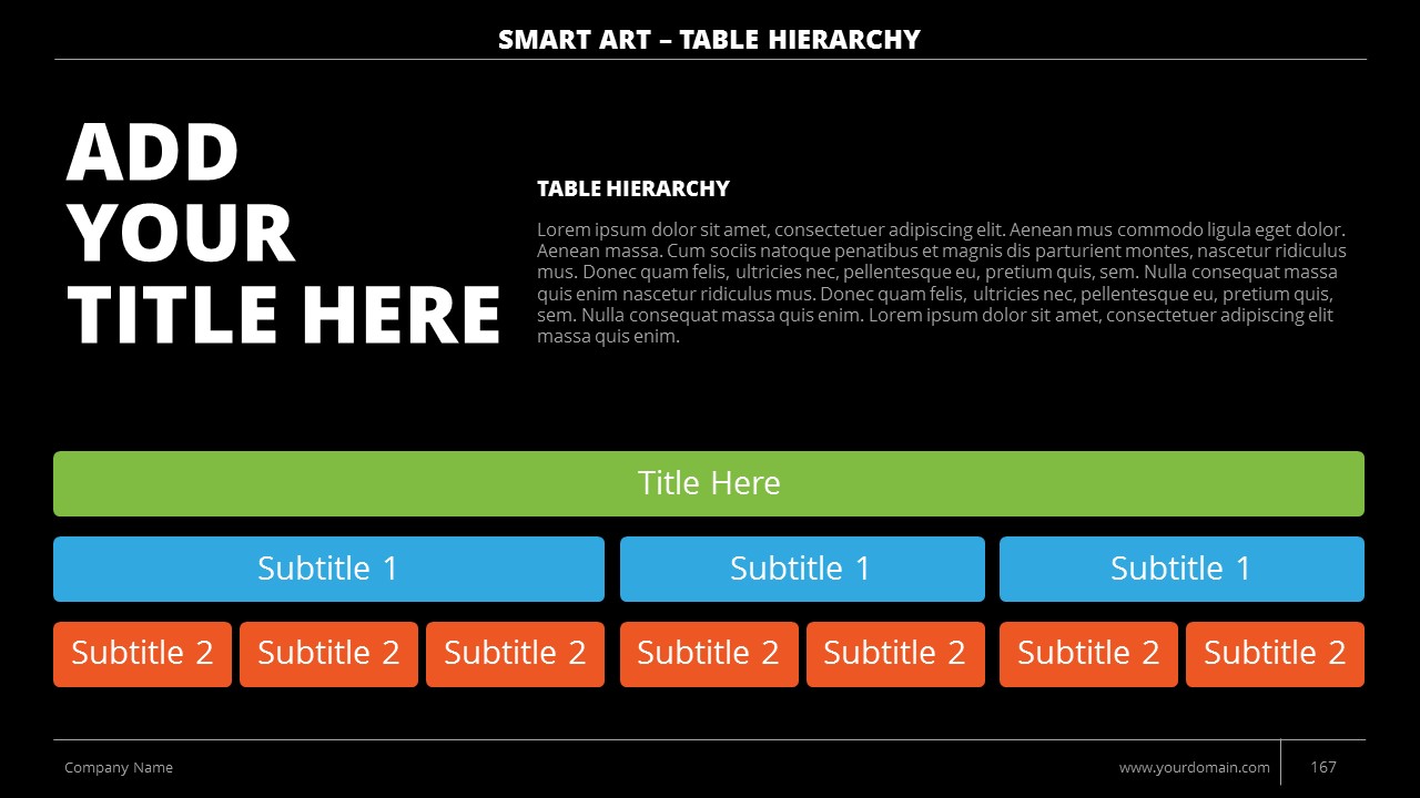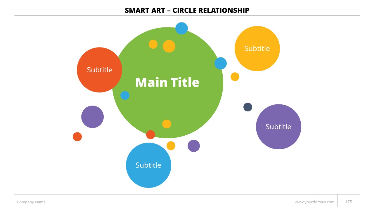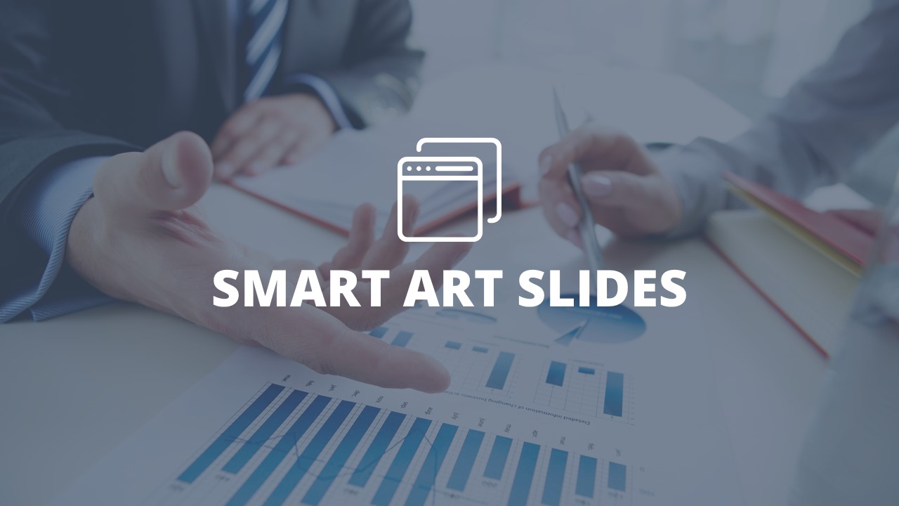 - +150 Categorized SmartArt Slides easy to use and edit (List SmartArt, Relationship SmartArt, Process SmartArt, Matrix SmartArt, Cycle SmartArt, Pyramid SmartArt, Hierarchy SmartArt, Picture SmartArt).