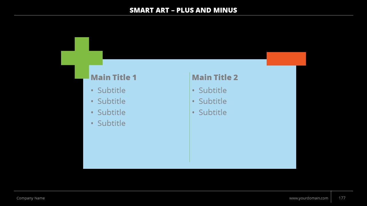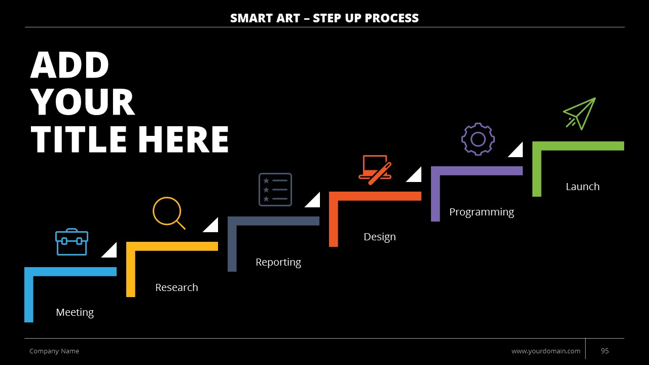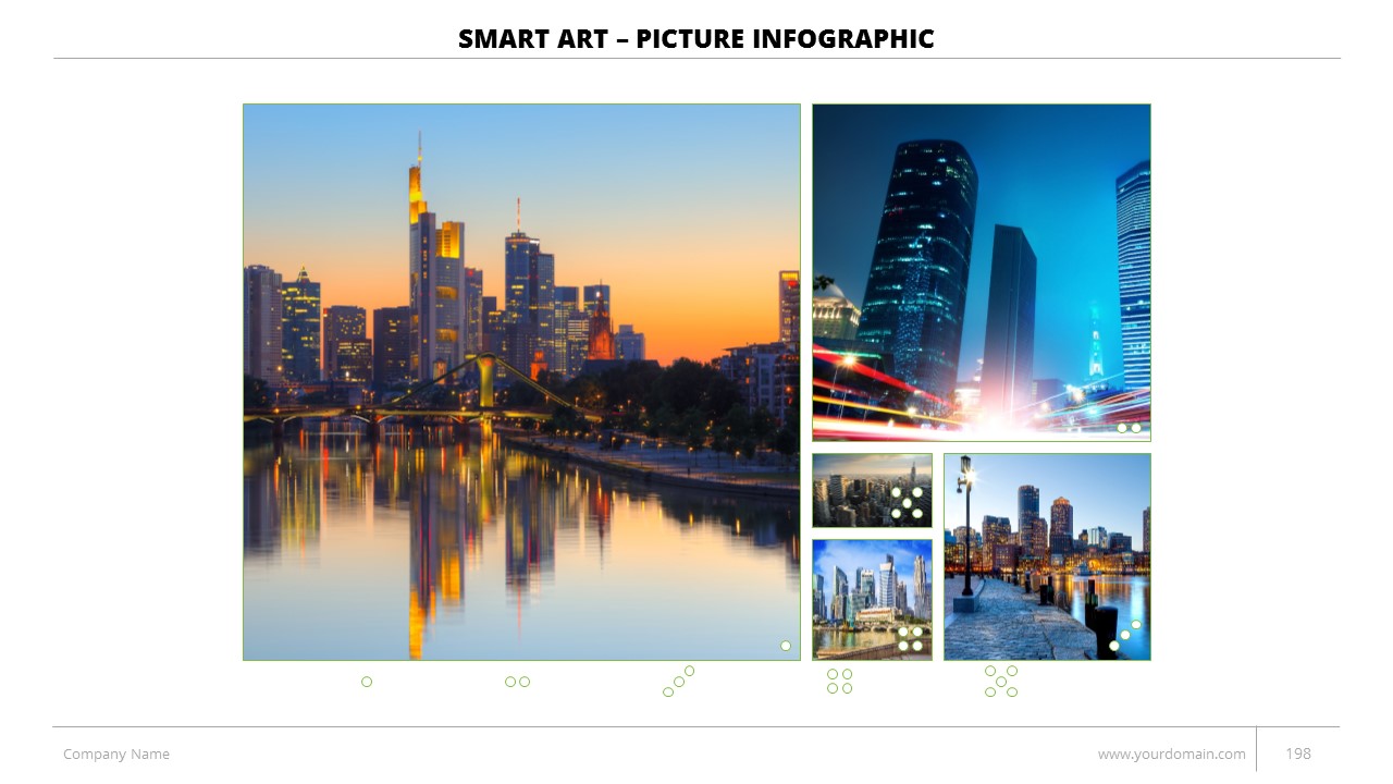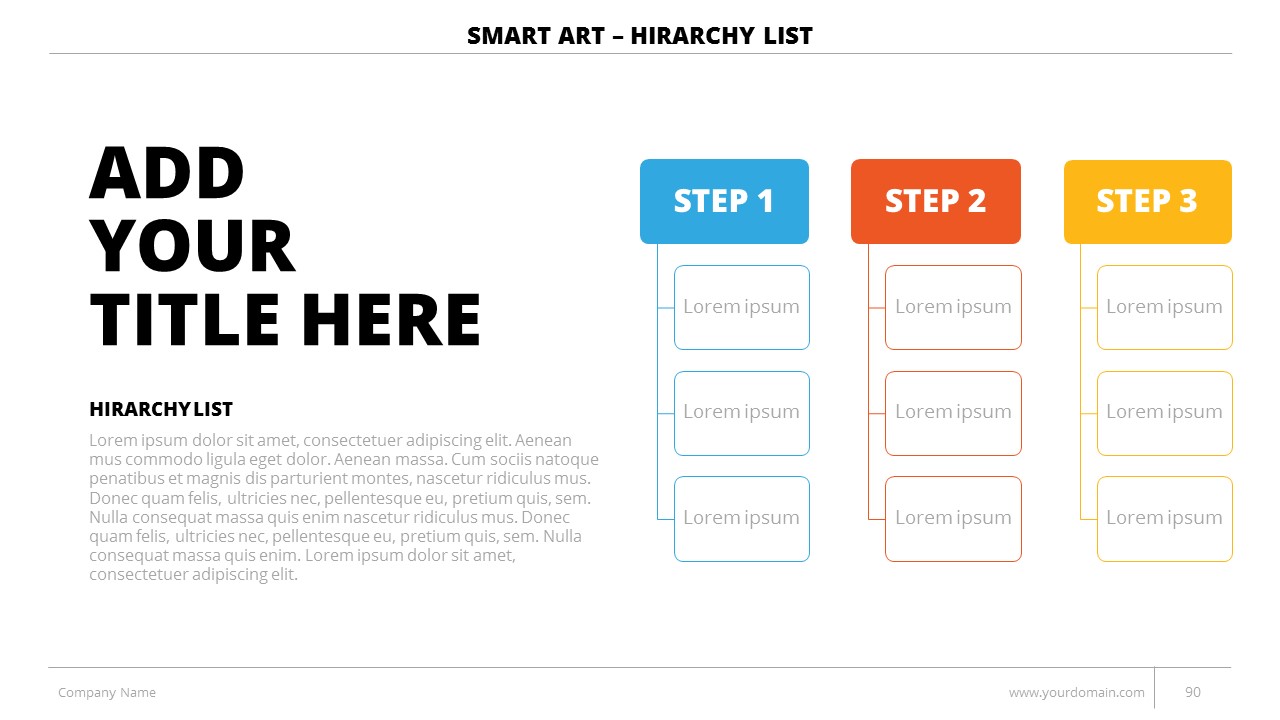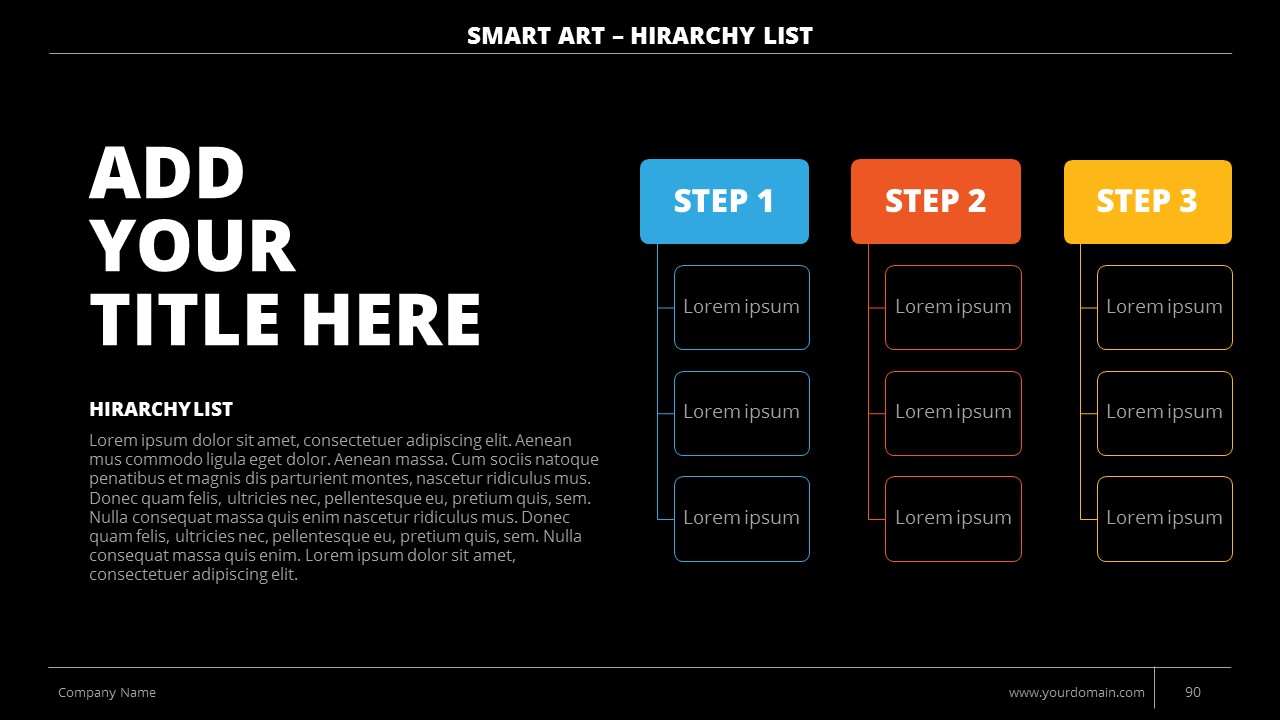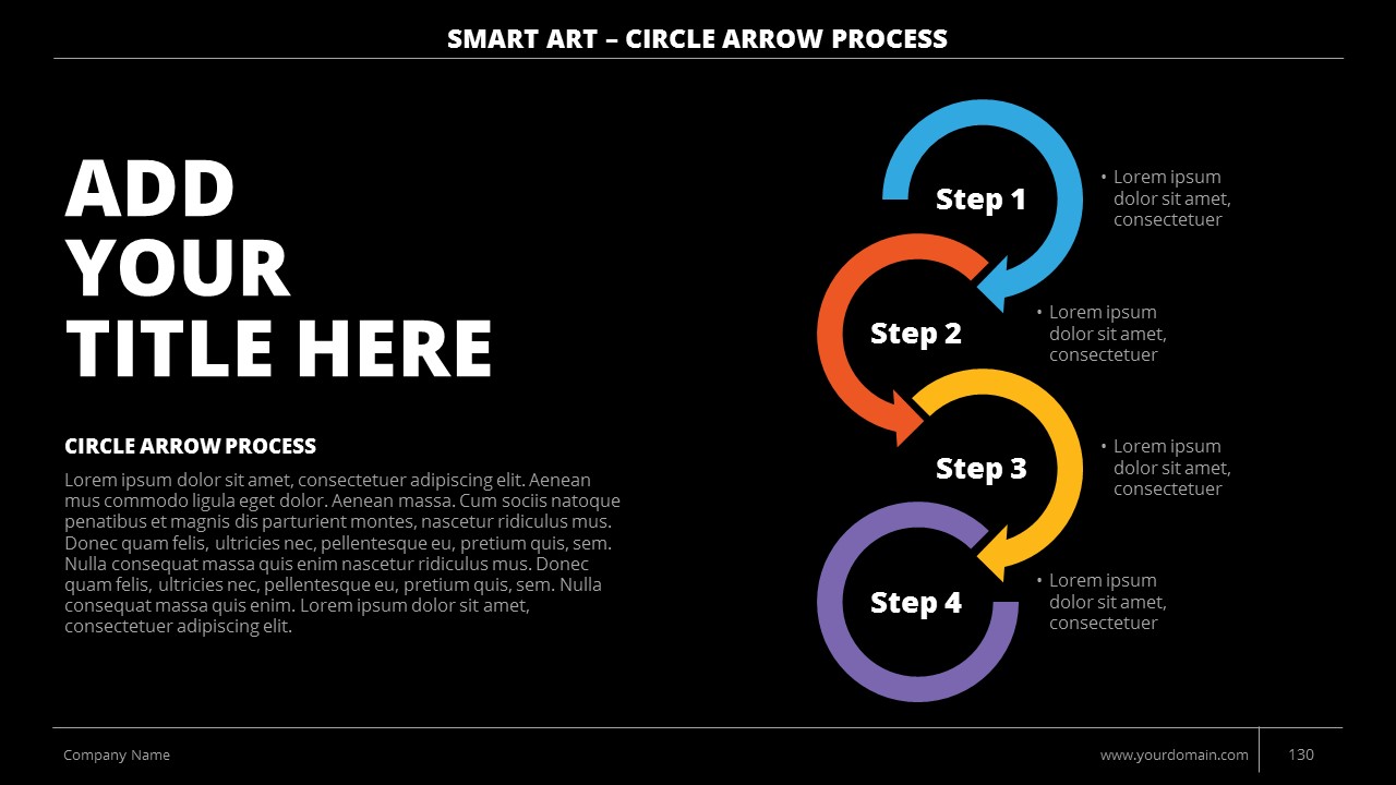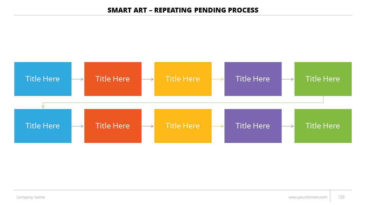 - +150 Categorized SmartArt Slides easy to use and edit (List SmartArt, Relationship SmartArt, Process SmartArt, Matrix SmartArt, Cycle SmartArt, Pyramid SmartArt, Hierarchy SmartArt, Picture SmartArt).