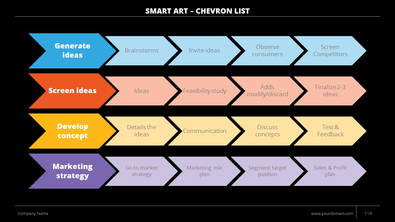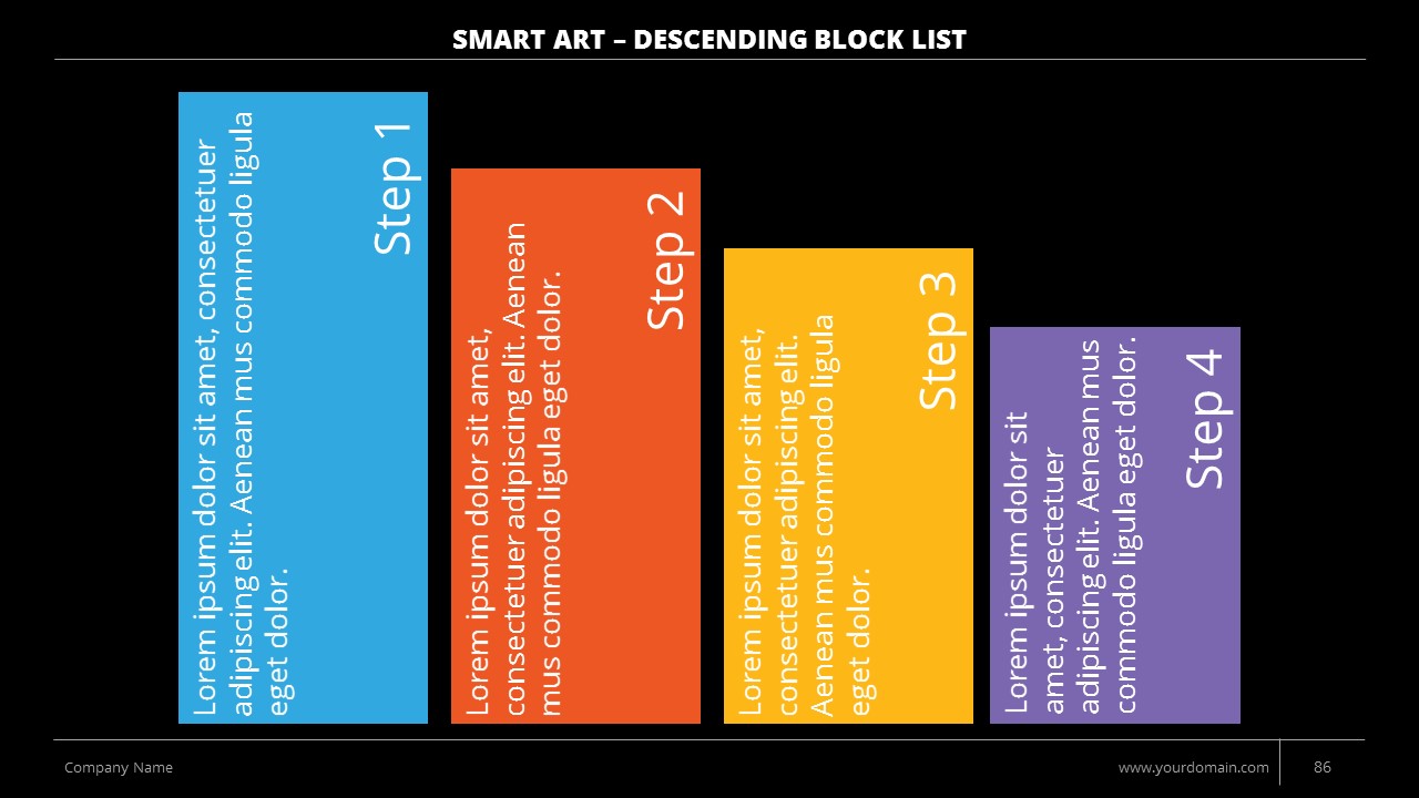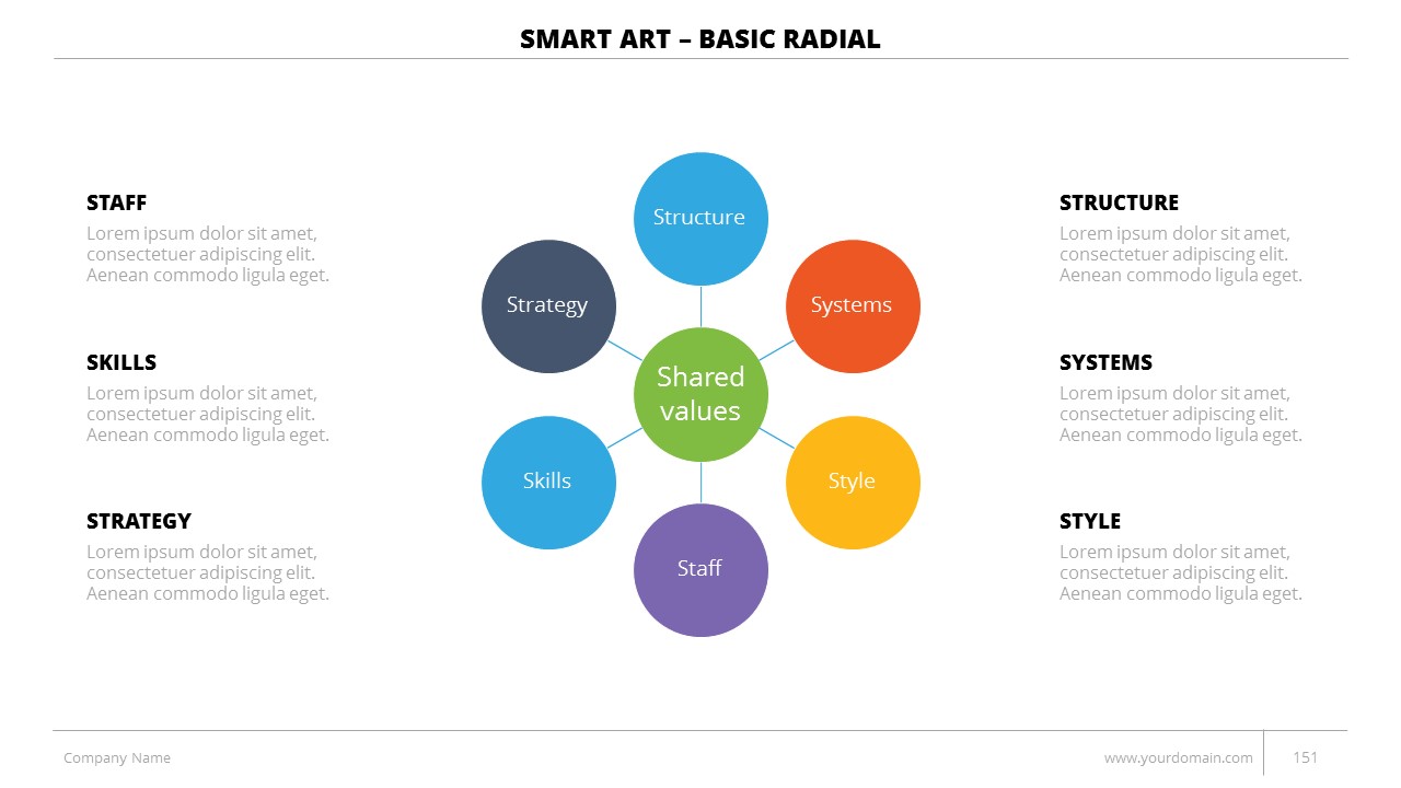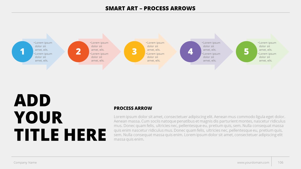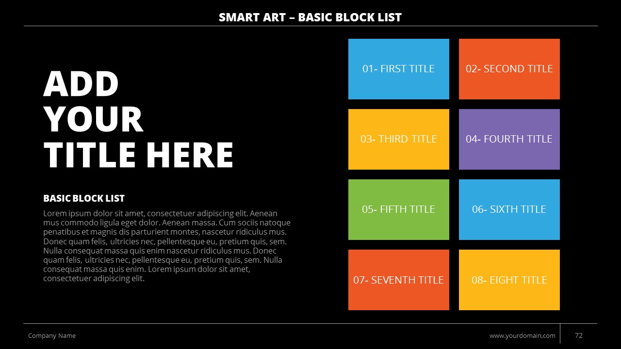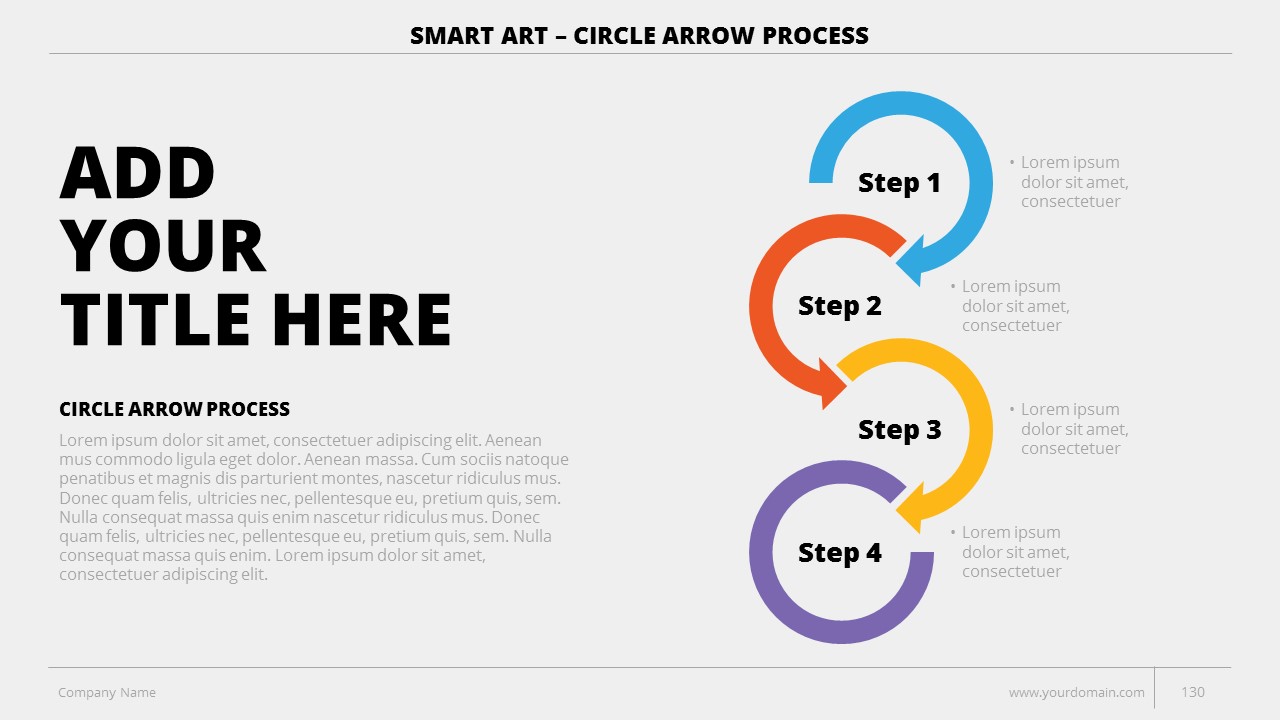 - +150 Categorized SmartArt Slides easy to use and edit (List SmartArt, Relationship SmartArt, Process SmartArt, Matrix SmartArt, Cycle SmartArt, Pyramid SmartArt, Hierarchy SmartArt, Picture SmartArt).