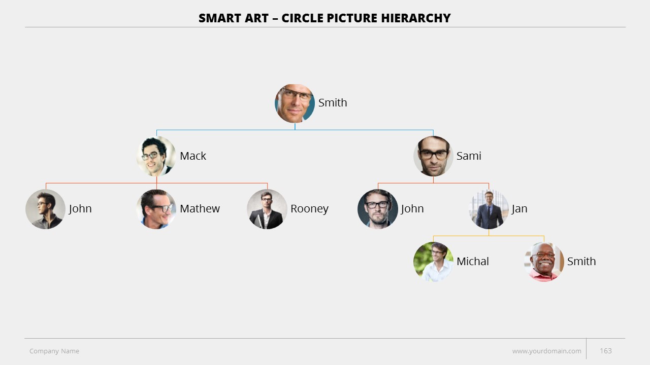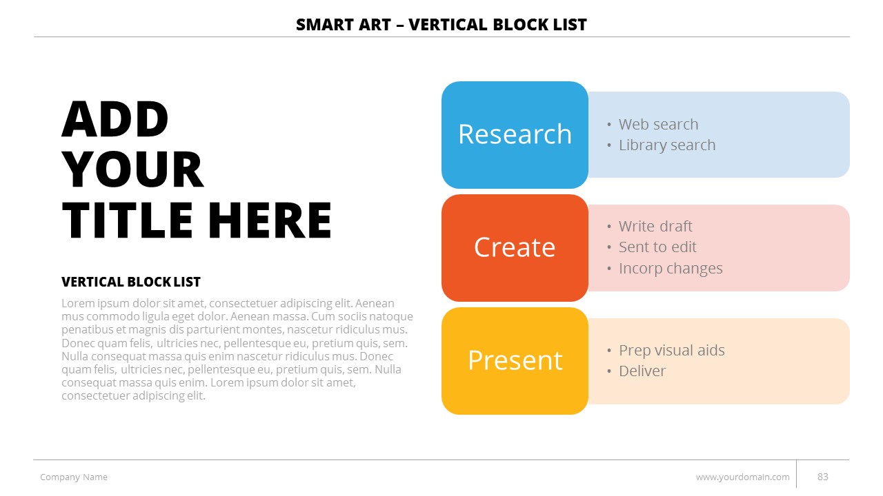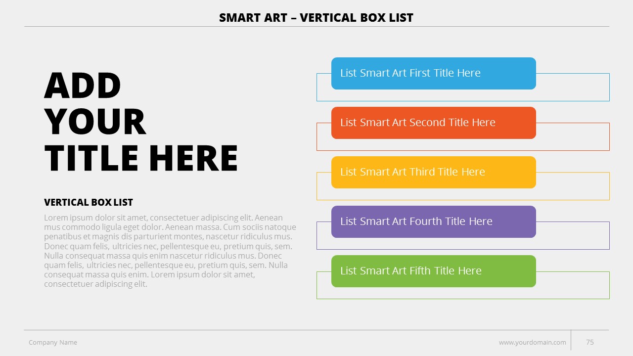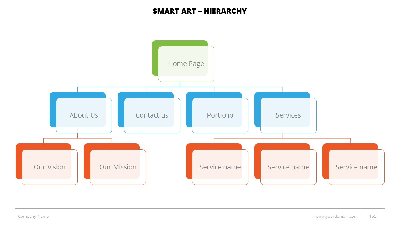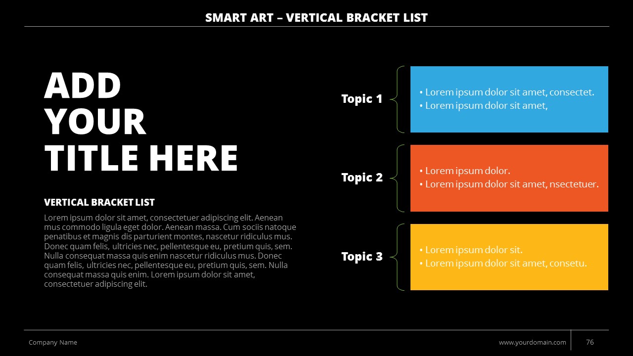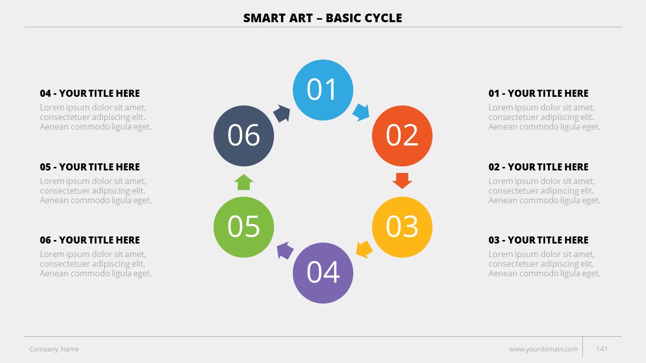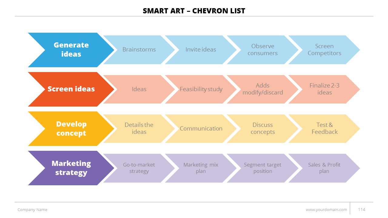 - +150 Categorized SmartArt Slides easy to use and edit (List SmartArt, Relationship SmartArt, Process SmartArt, Matrix SmartArt, Cycle SmartArt, Pyramid SmartArt, Hierarchy SmartArt, Picture SmartArt).