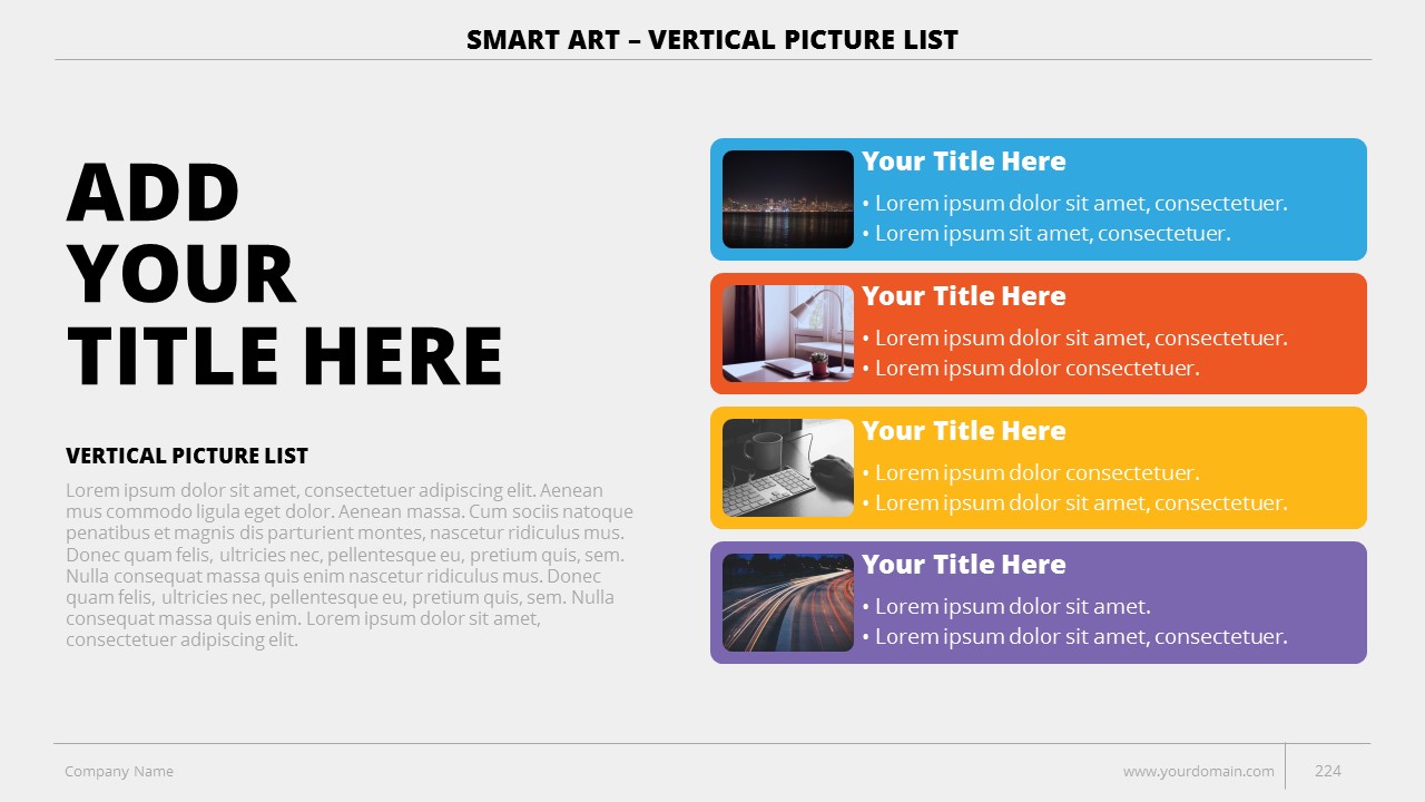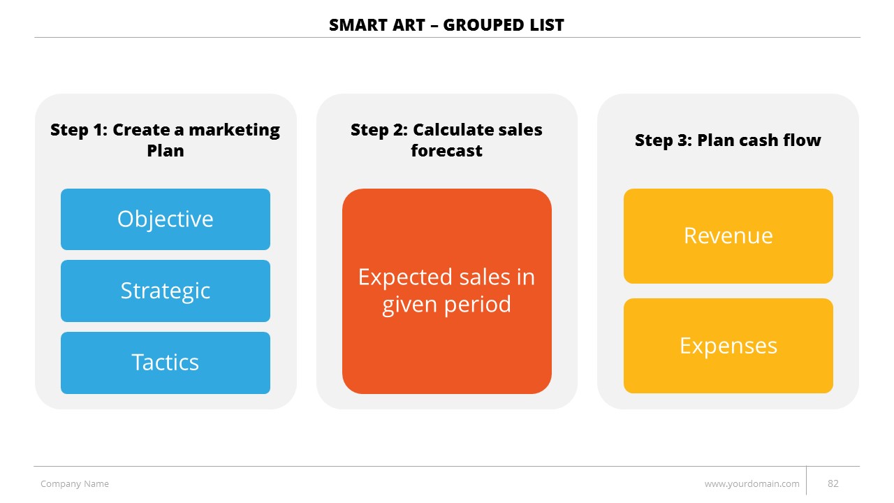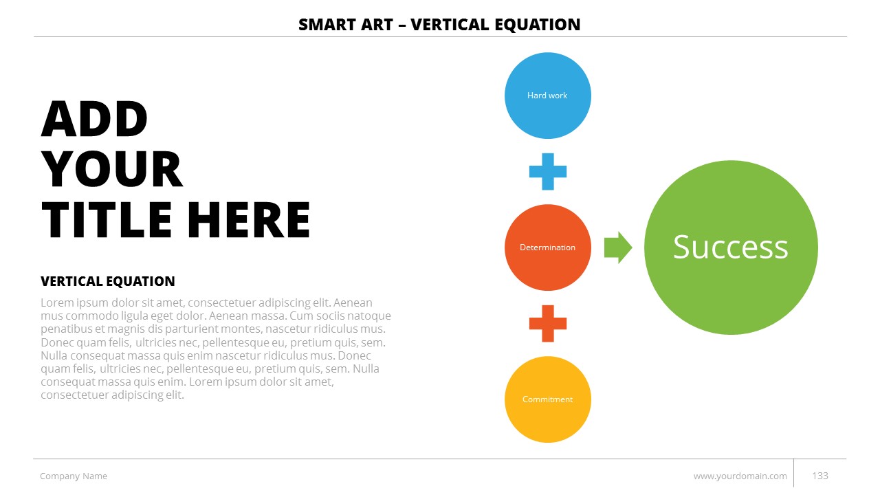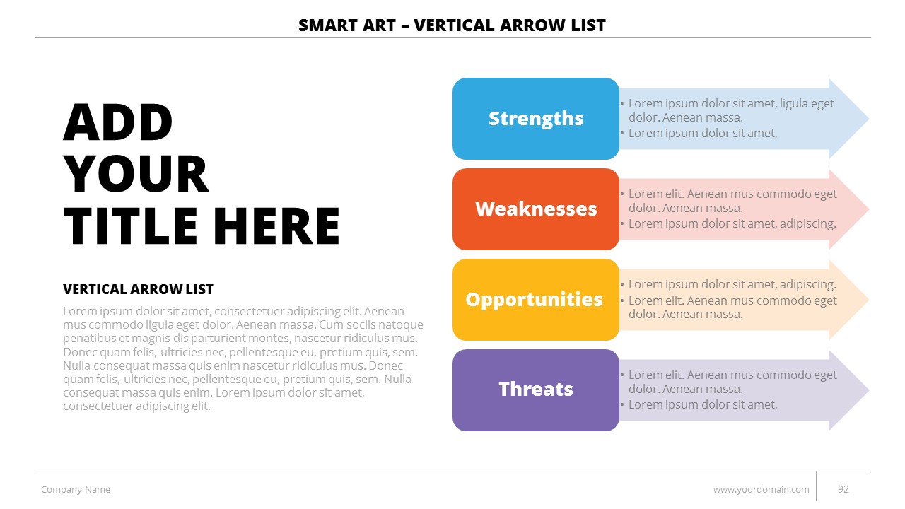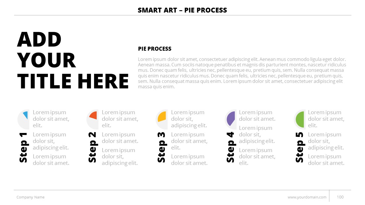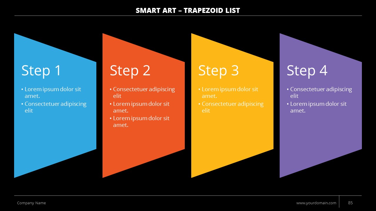 - +150 Categorized SmartArt Slides easy to use and edit (List SmartArt, Relationship SmartArt, Process SmartArt, Matrix SmartArt, Cycle SmartArt, Pyramid SmartArt, Hierarchy SmartArt, Picture SmartArt).