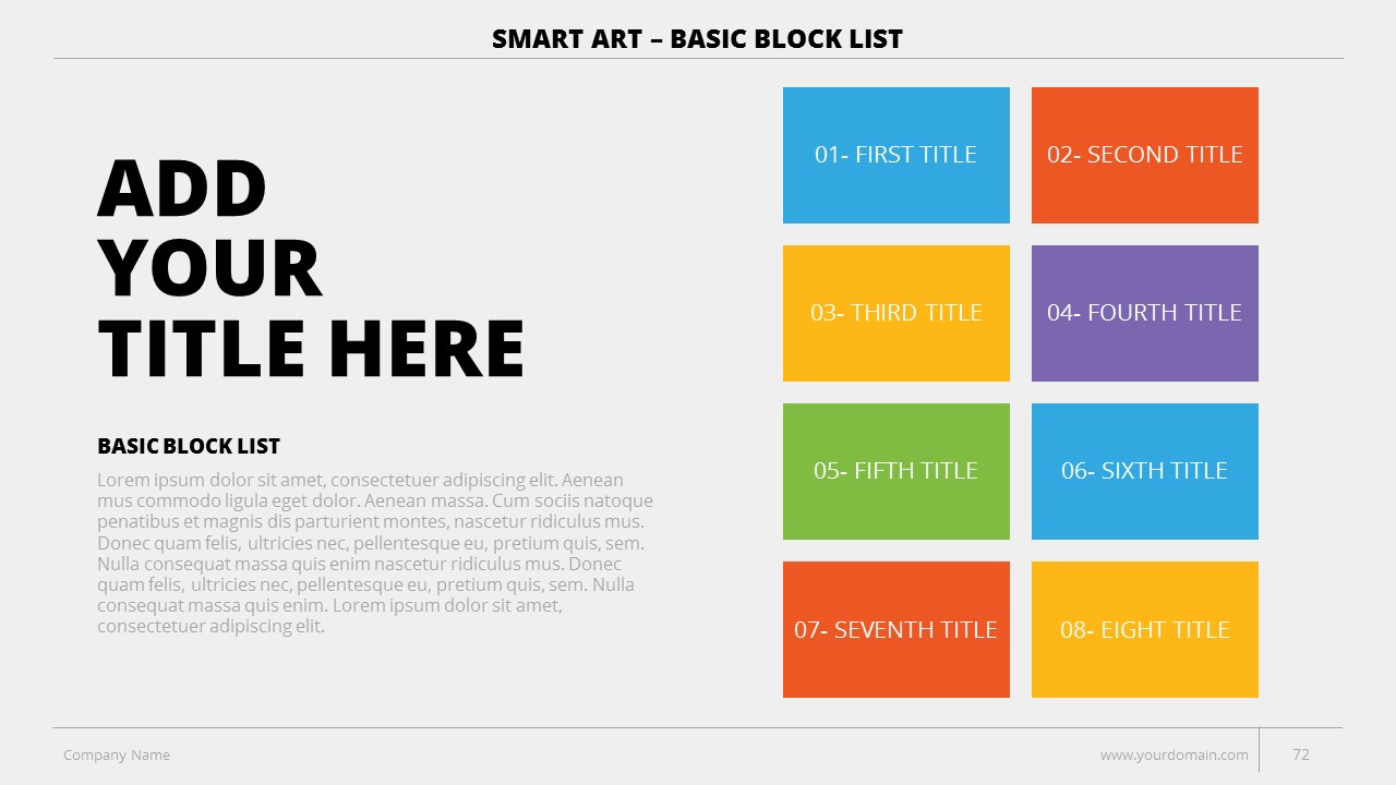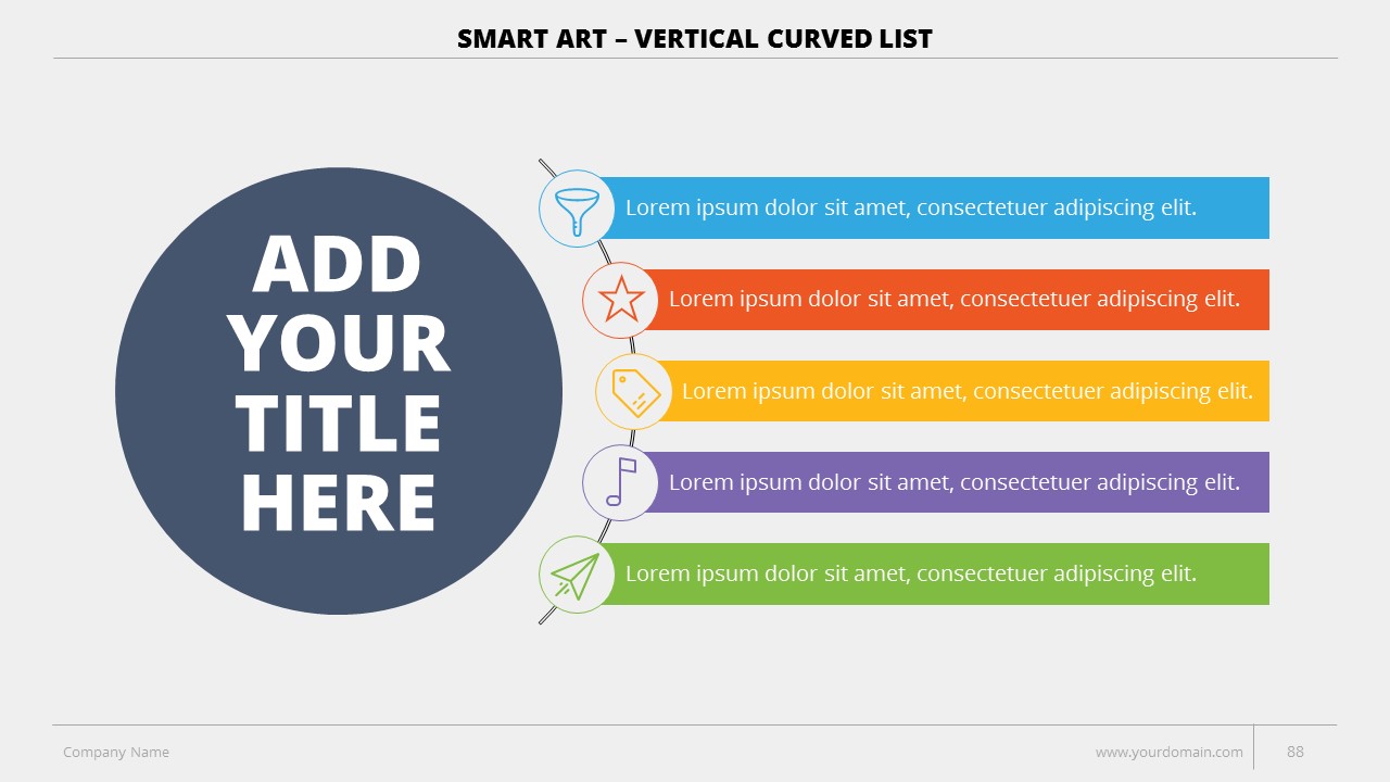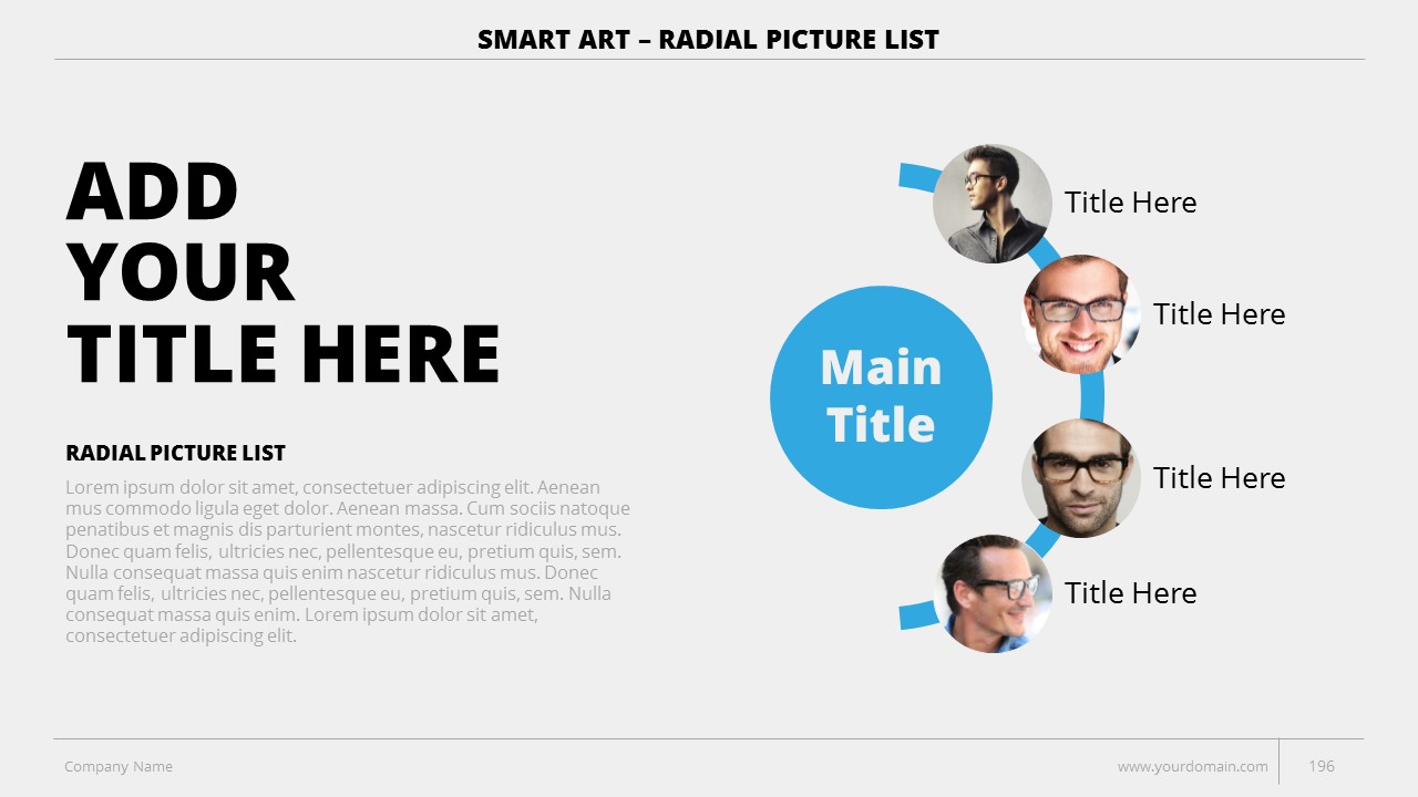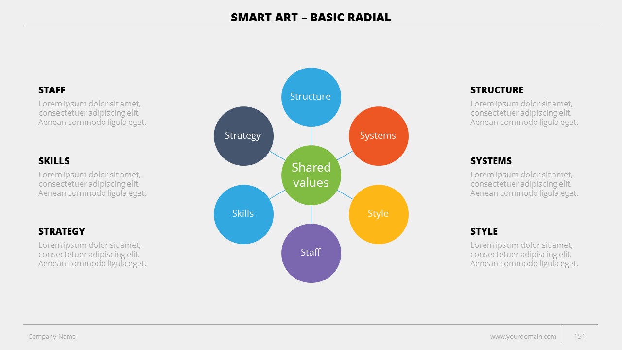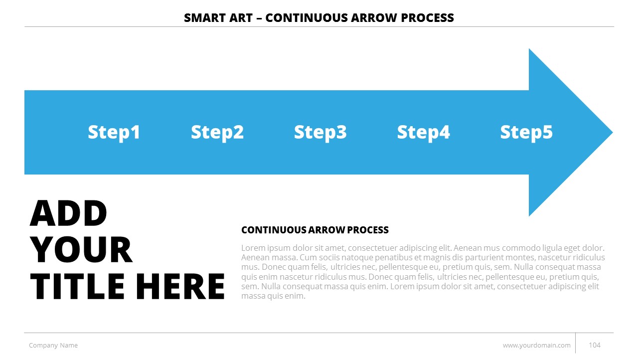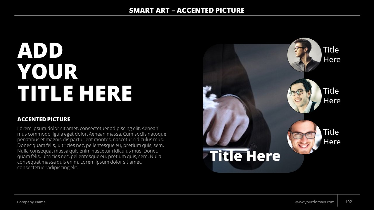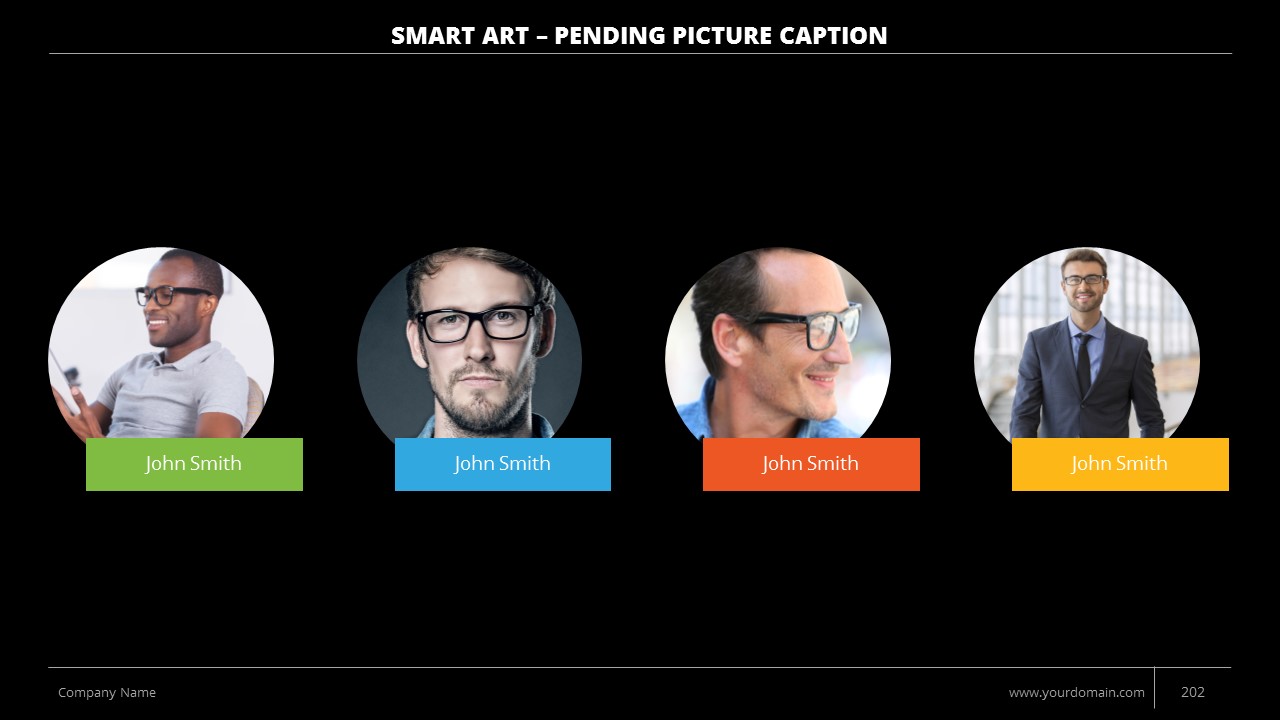- +150 Categorized SmartArt Slides easy to use and edit (List SmartArt, Relationship SmartArt, Process SmartArt, Matrix SmartArt, Cycle SmartArt, Pyramid SmartArt, Hierarchy SmartArt, Picture SmartArt).