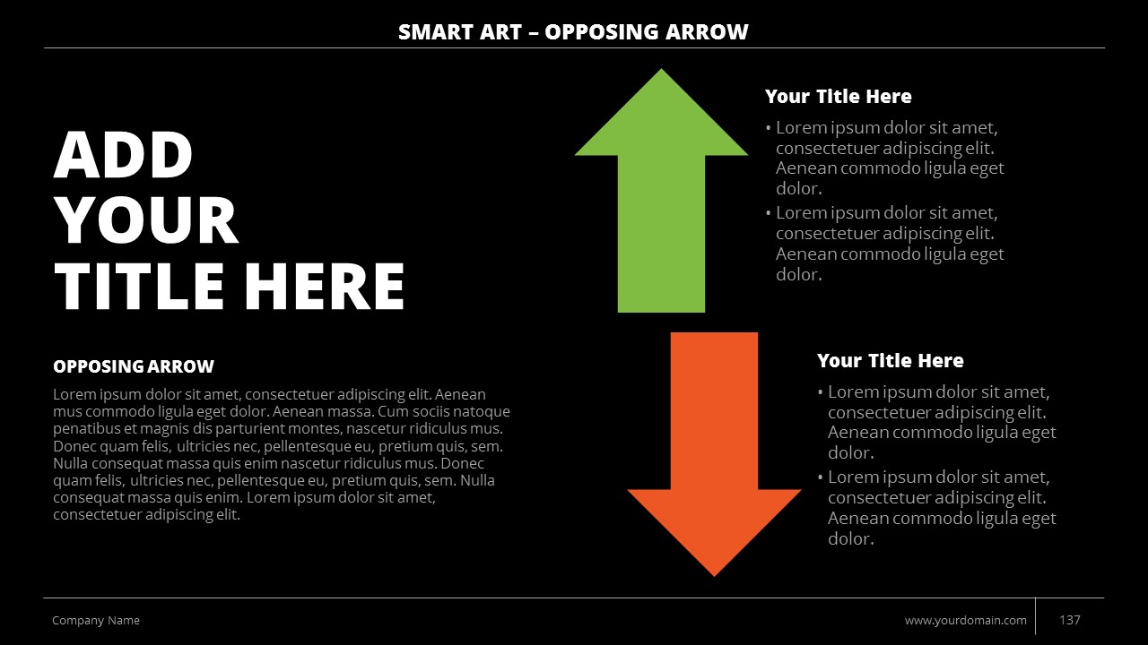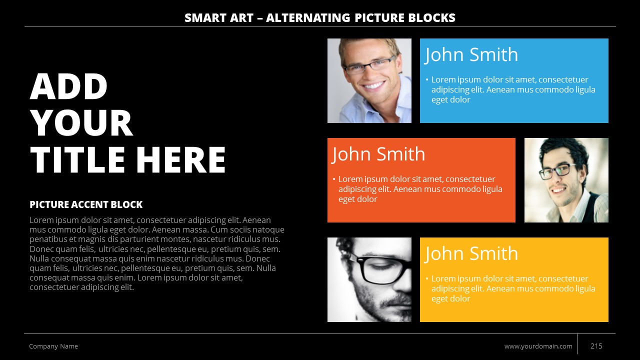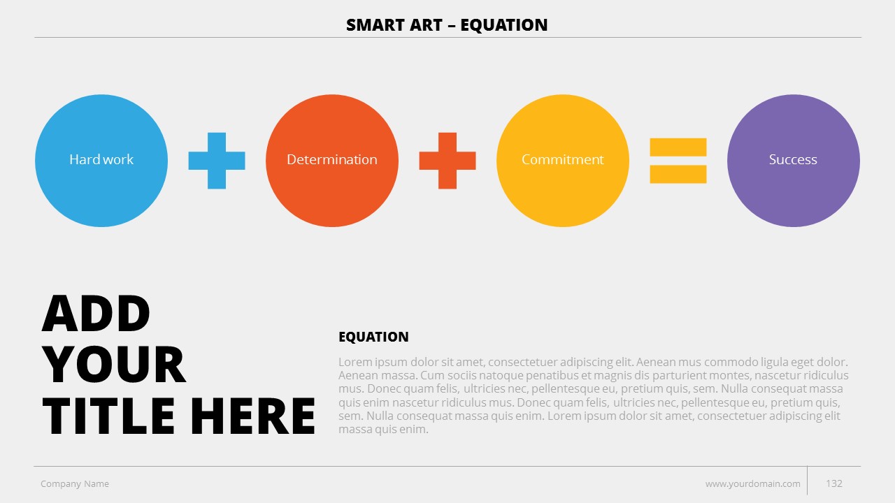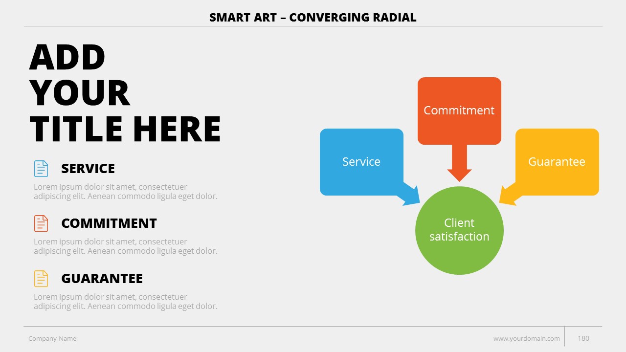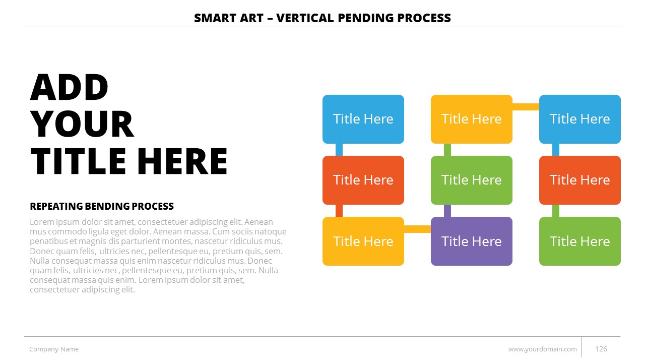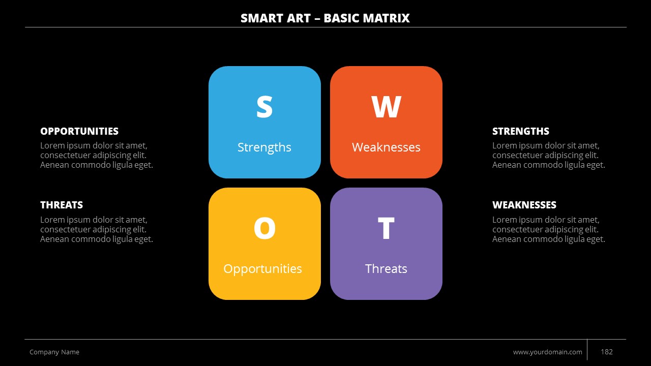 - +150 Categorized SmartArt Slides easy to use and edit (List SmartArt, Relationship SmartArt, Process SmartArt, Matrix SmartArt, Cycle SmartArt, Pyramid SmartArt, Hierarchy SmartArt, Picture SmartArt).