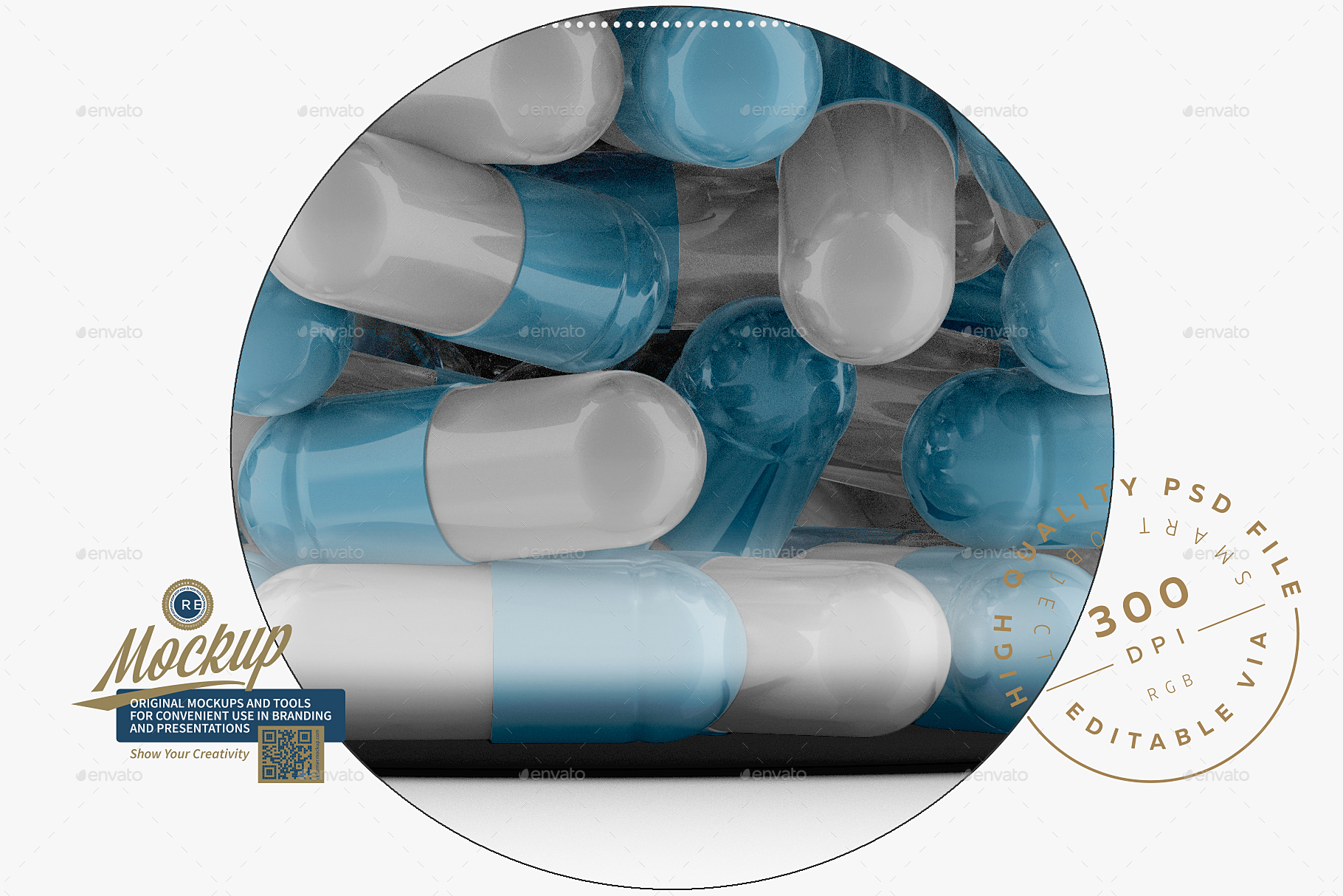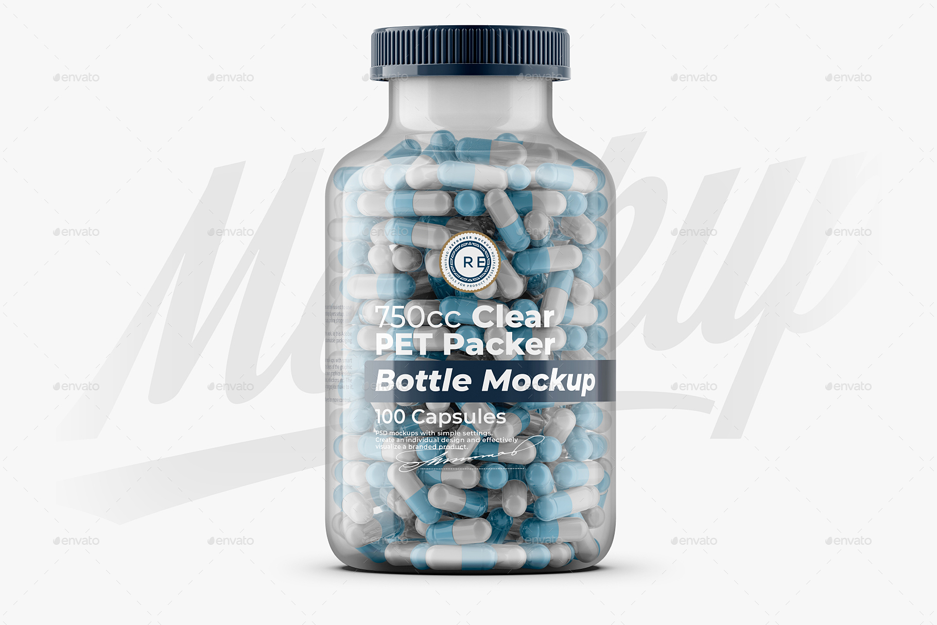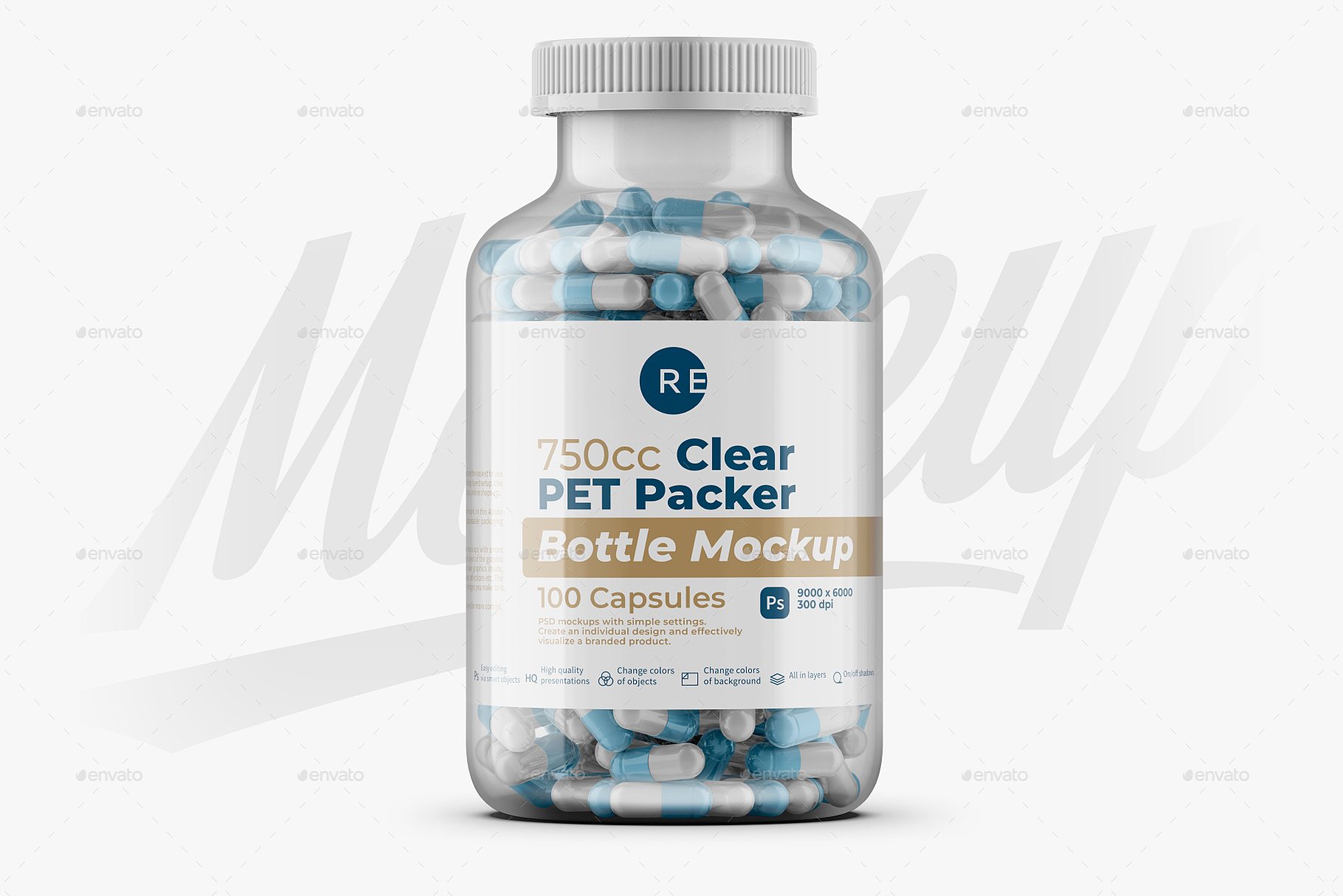 And here is another Clear Pills Bottle Mockup 750CC. The PSD file is multi-layered with intuitive settings, has hints in the names of the layers and instructions to facilitate the work. It’s easy to add your own printed logo design and background color in smart layers, just double-click the layer’s thumbnail and paste your image. large resolution (height 6000px / 300 dpi) will ensure realism even at maximum magnification. The jar shadow can be hidden, the background color can be changed or left transparent.