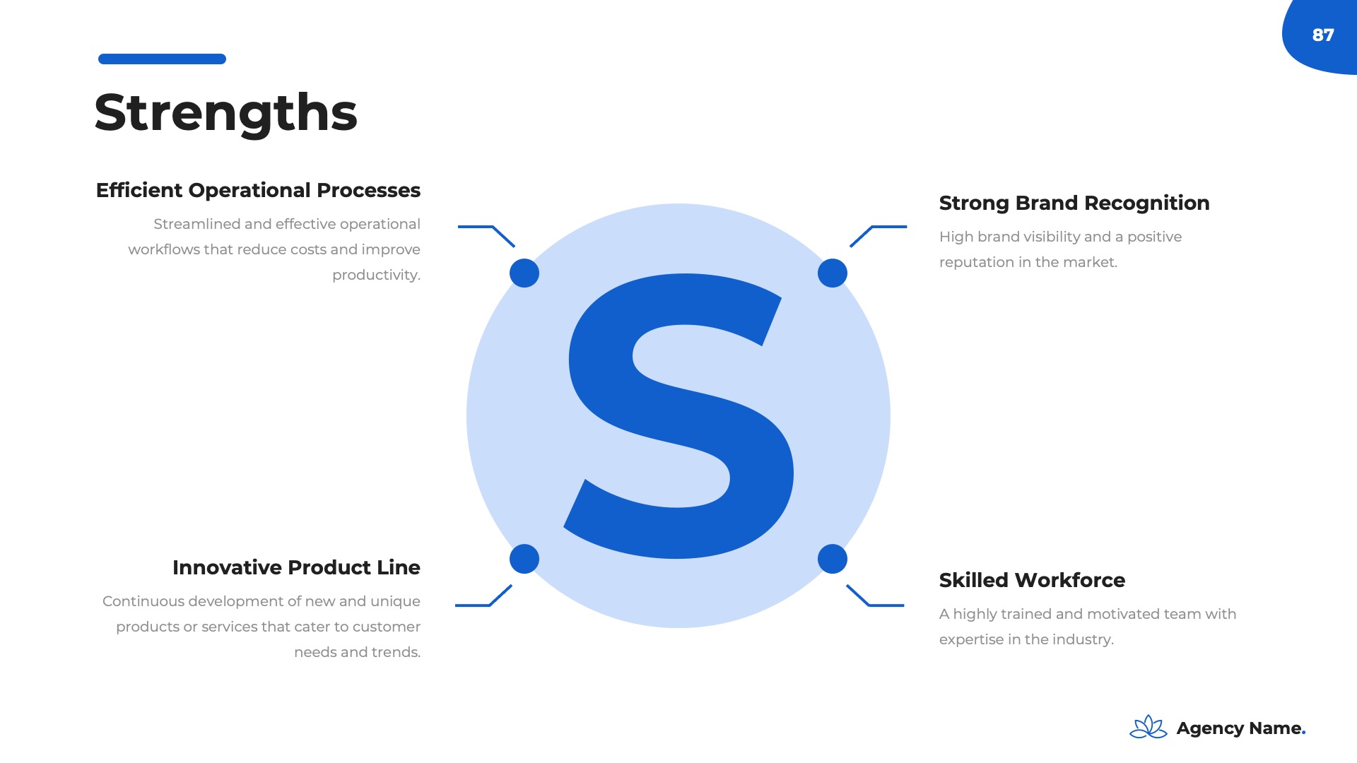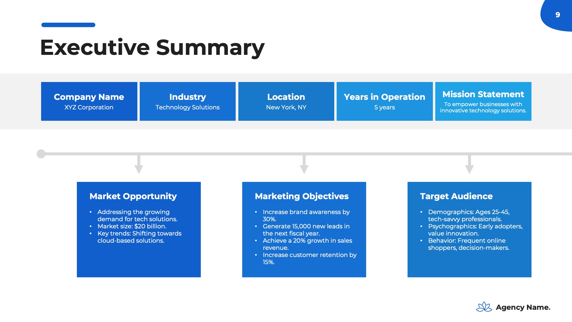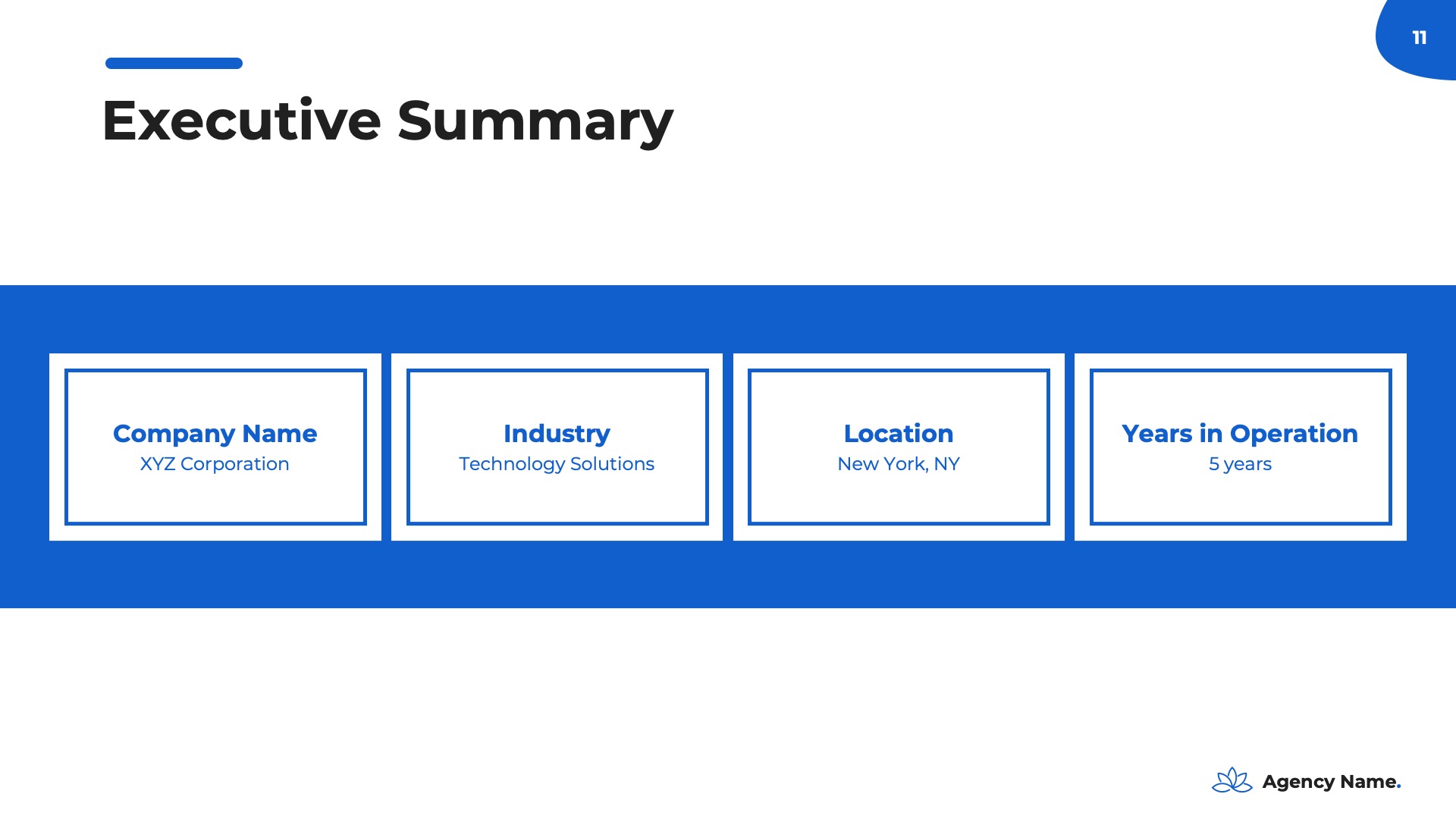 The ‘Company Overview’ is your presentation’s foundation, offering a thorough introduction to your business and leaving a positive first impression. This section is essential for familiarizing your audience with your company’s values and achievements, setting the stage for the rest of your marketing plan. Within this section, you’ll encounter the following slides:- Logo And Company Name