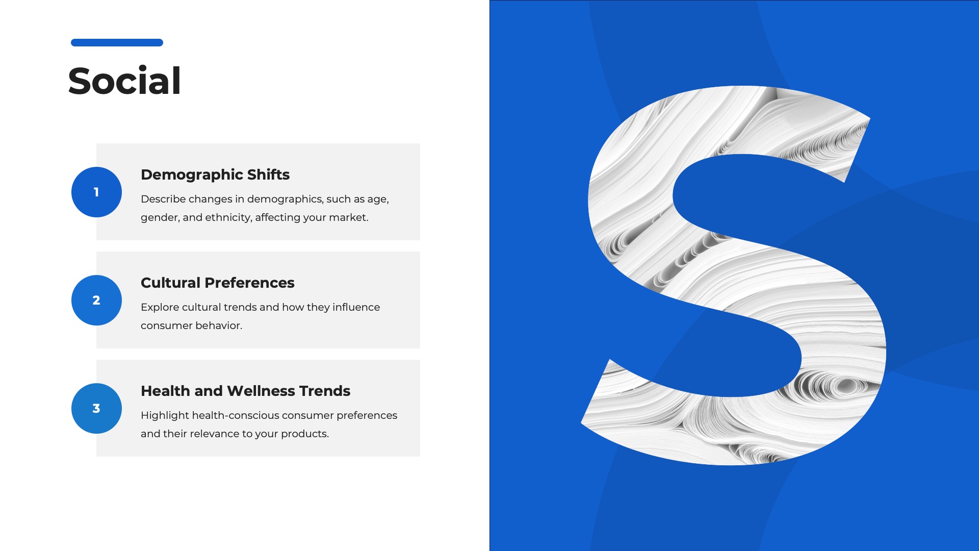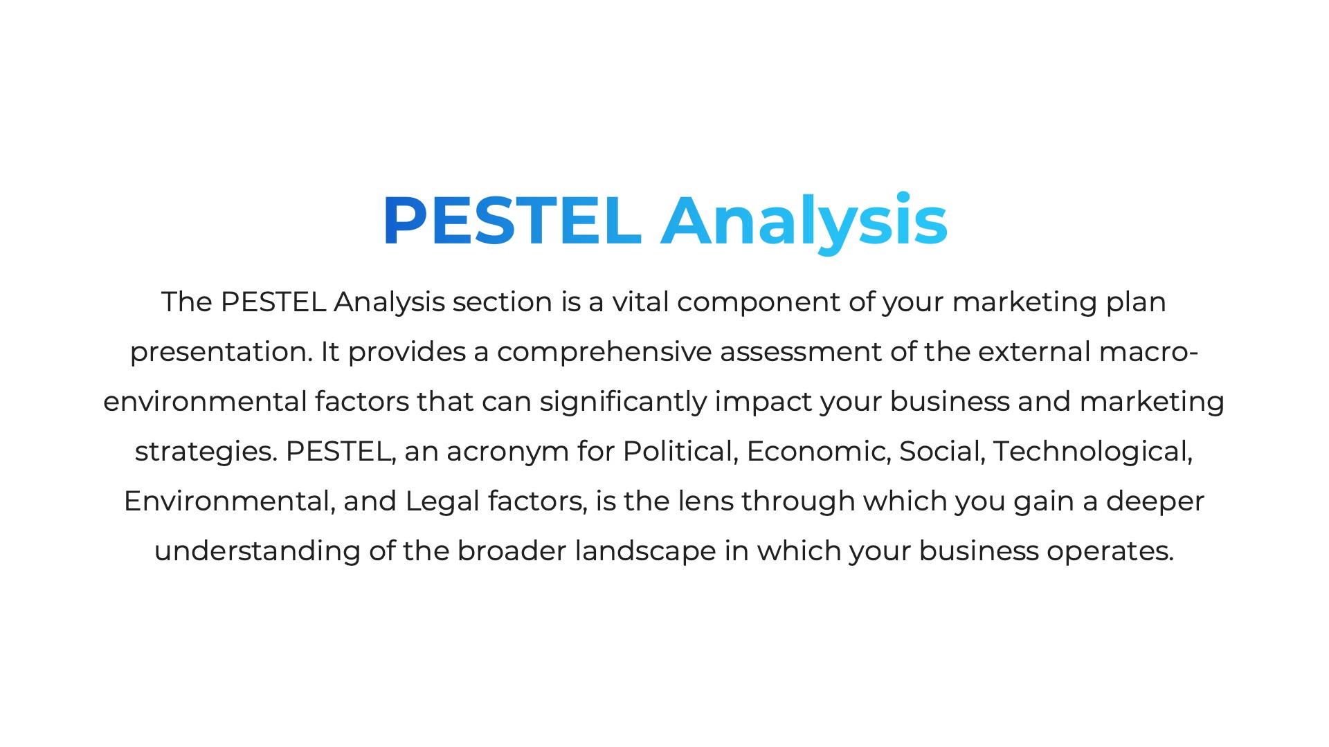 The ‘Market Research and Analysis’ section forms the bedrock for your upcoming marketing strategies. It offers valuable insights into your market’s dynamics and provides a deeper understanding of the external environment, customer behaviors, and competitors. This critical component ensures your marketing strategies are well-informed and market-savvy. Within this section, you’ll encounter the following slides:- Market Research.