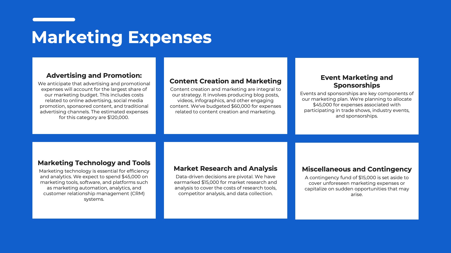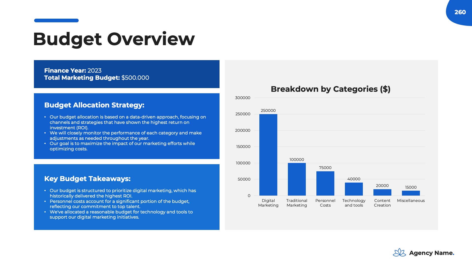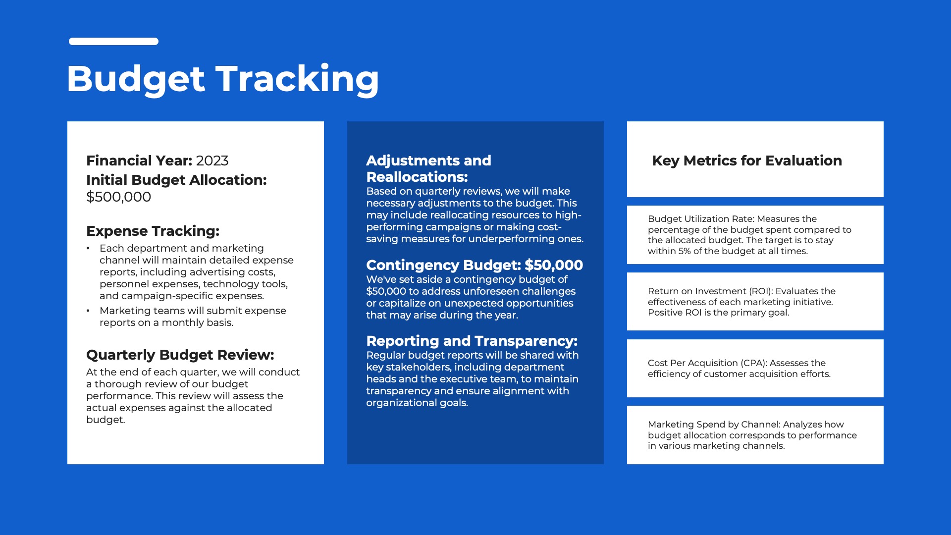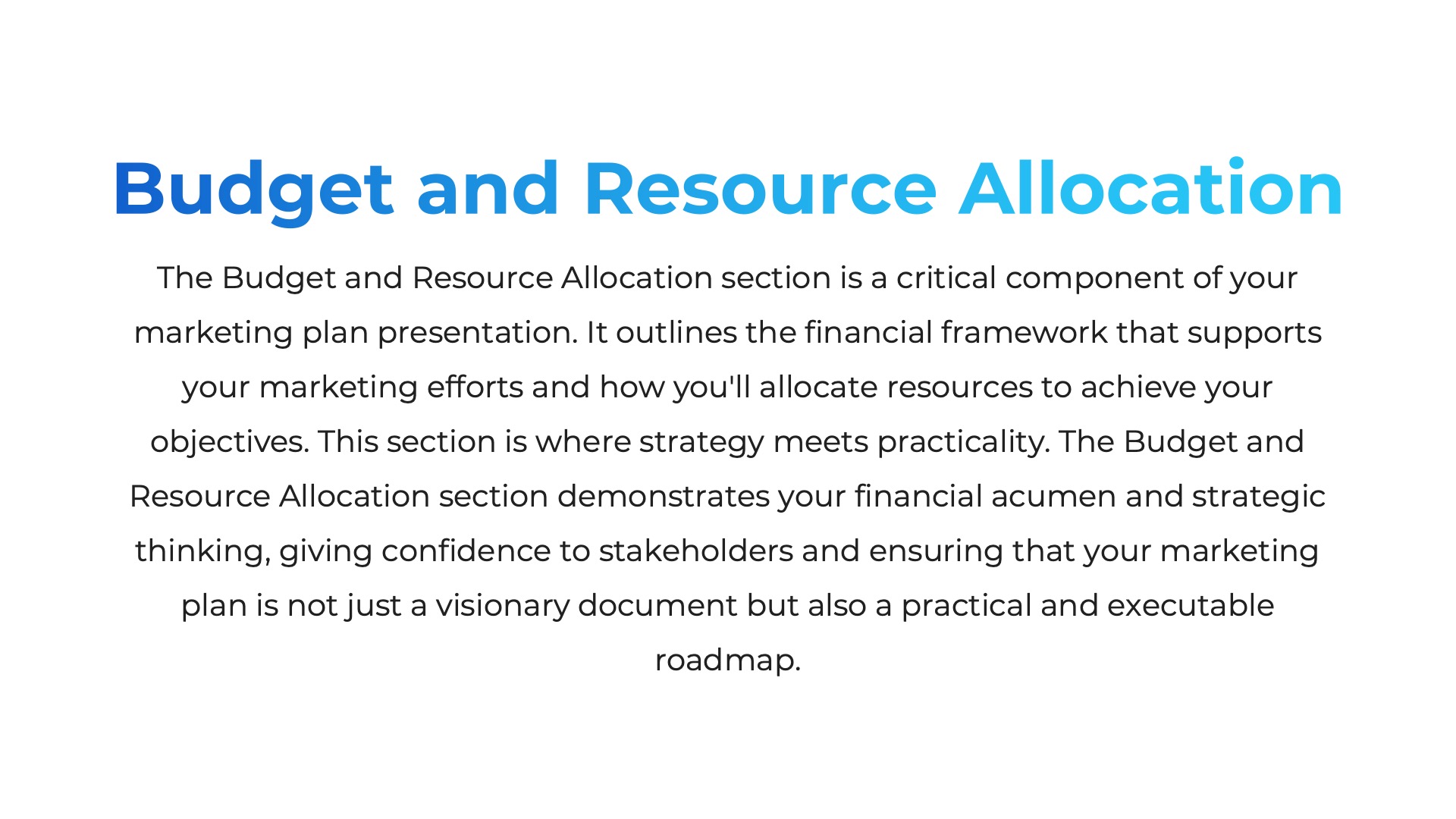The Budget and Resource Allocation section is crucial for your marketing plan. It outlines your financial and resource strategies in a practical manner, demonstrating your strategic and financial expertise. This section ensures your plan is not just a vision but a feasible roadmap to success. Within this section, you’ll encounter the following slides:- Budget Overview