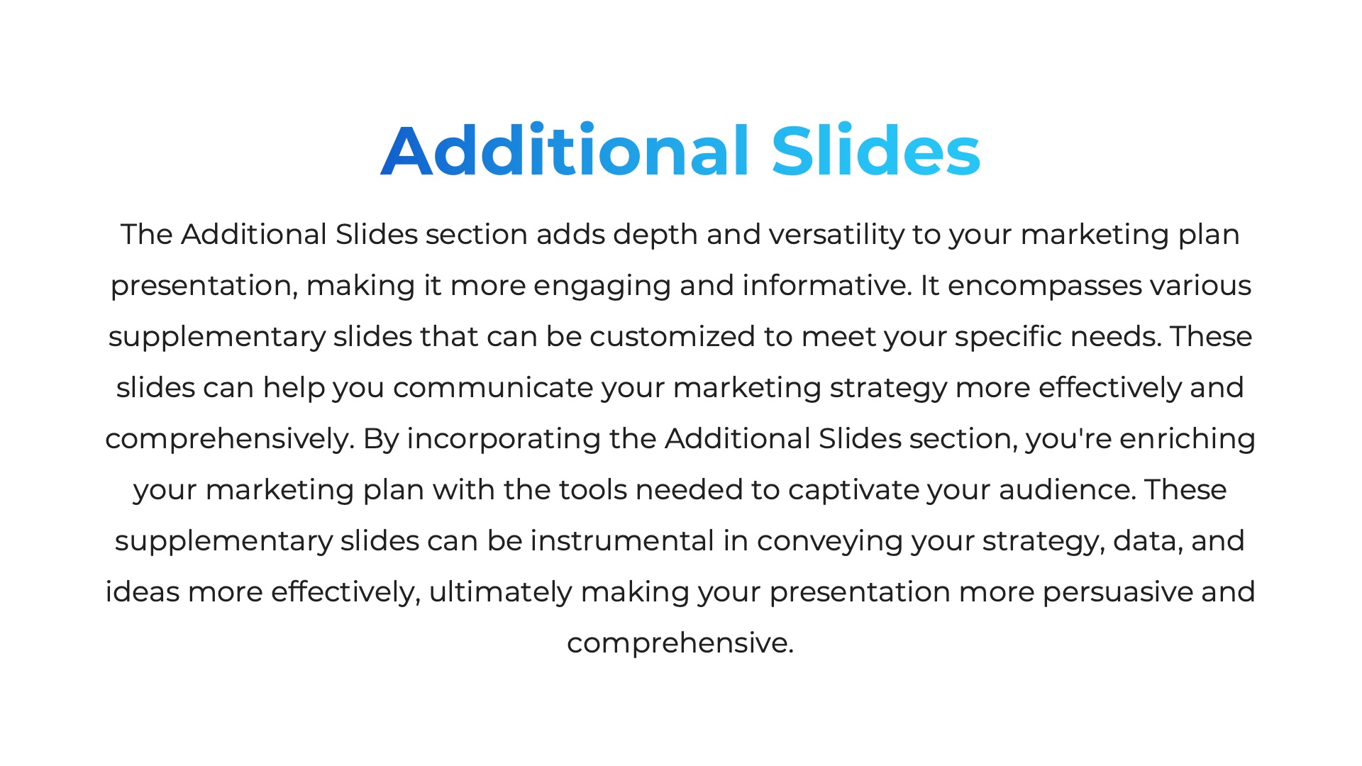 The Additional Slides section enhances your marketing plan presentation, offering versatility and depth. With customizable supplementary slides, you can effectively communicate your strategy, data, and ideas, enriching your presentation’s persuasiveness and comprehensiveness. Within this section, you’ll encounter the following slides:- Mobile Mockup